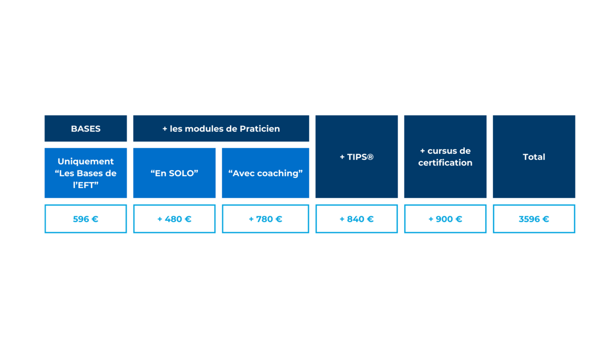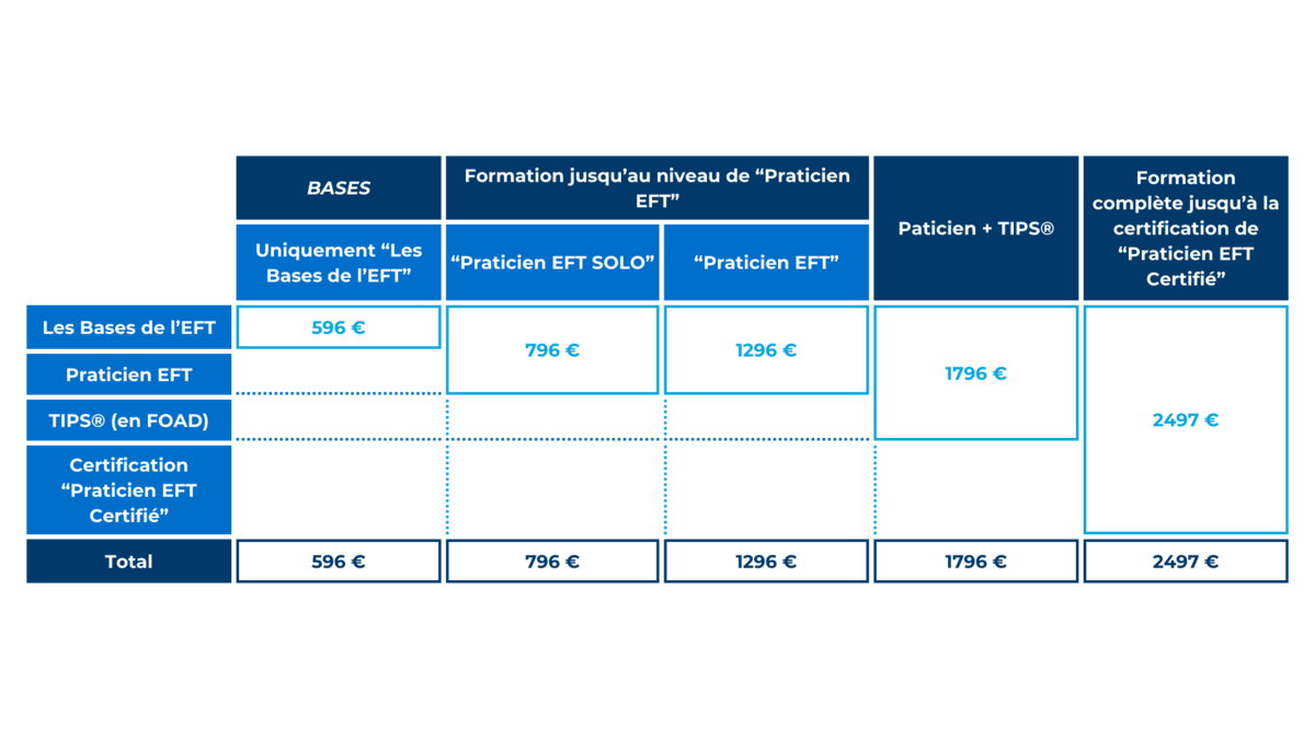 Tableau récapitulatif des tarifs de formation EFT selon le niveau d'étude souhaité pour des personnes finançant elles-mêmes leur formation.
