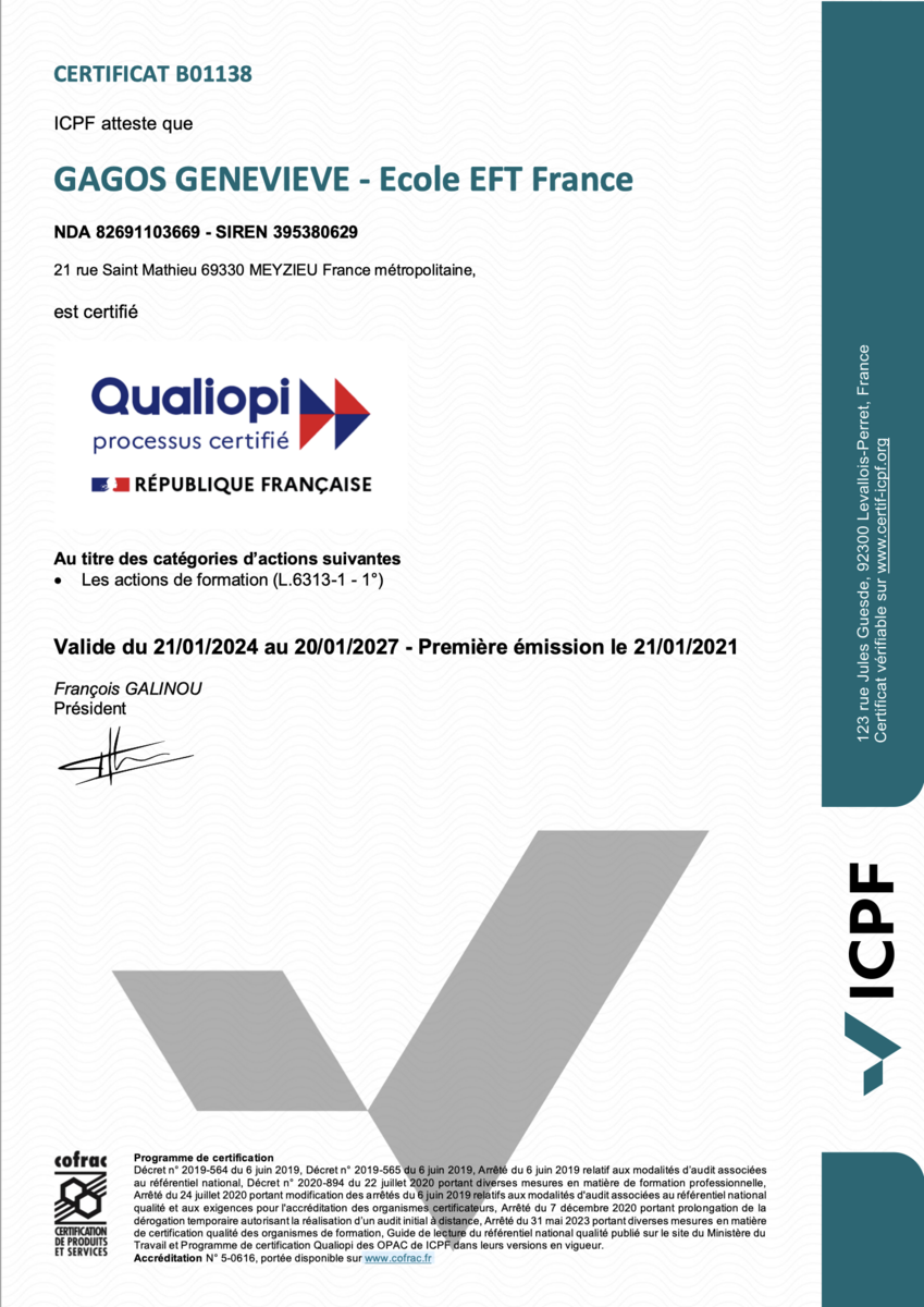 Pour contacter l'Ecole EFT France, centre de formation référent en EFT (avec la certification officielle : Qualiopi)