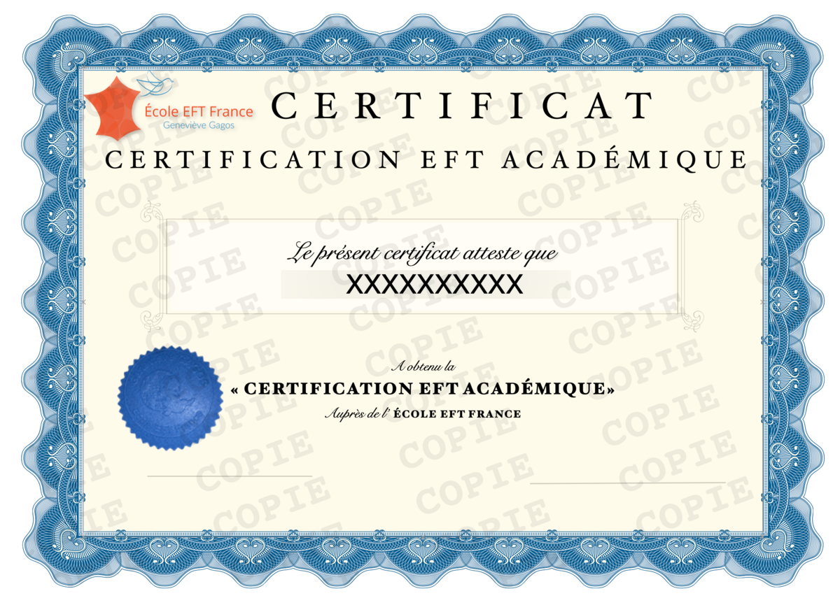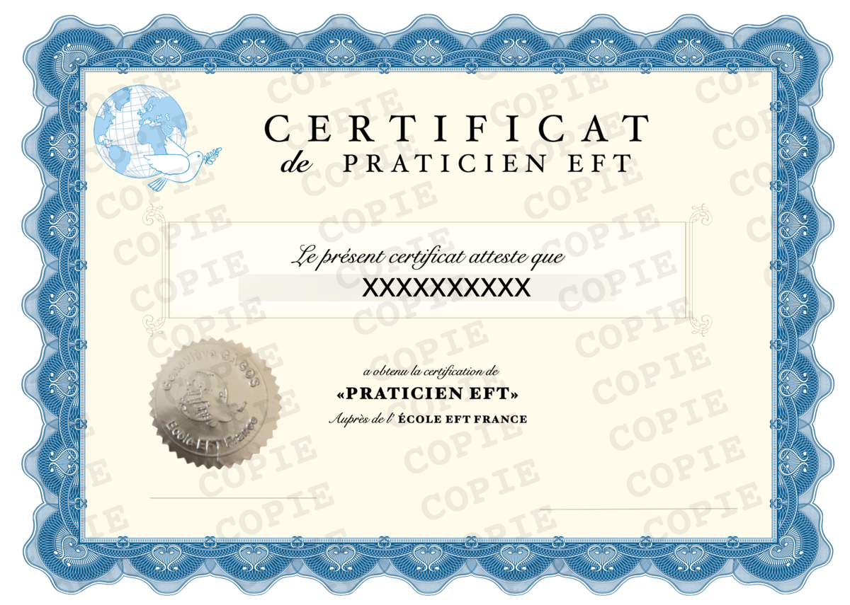 - C'est après cet entretien validé que vous êtes nommé « Praticien EFT Certifié » de l'École EFT France,